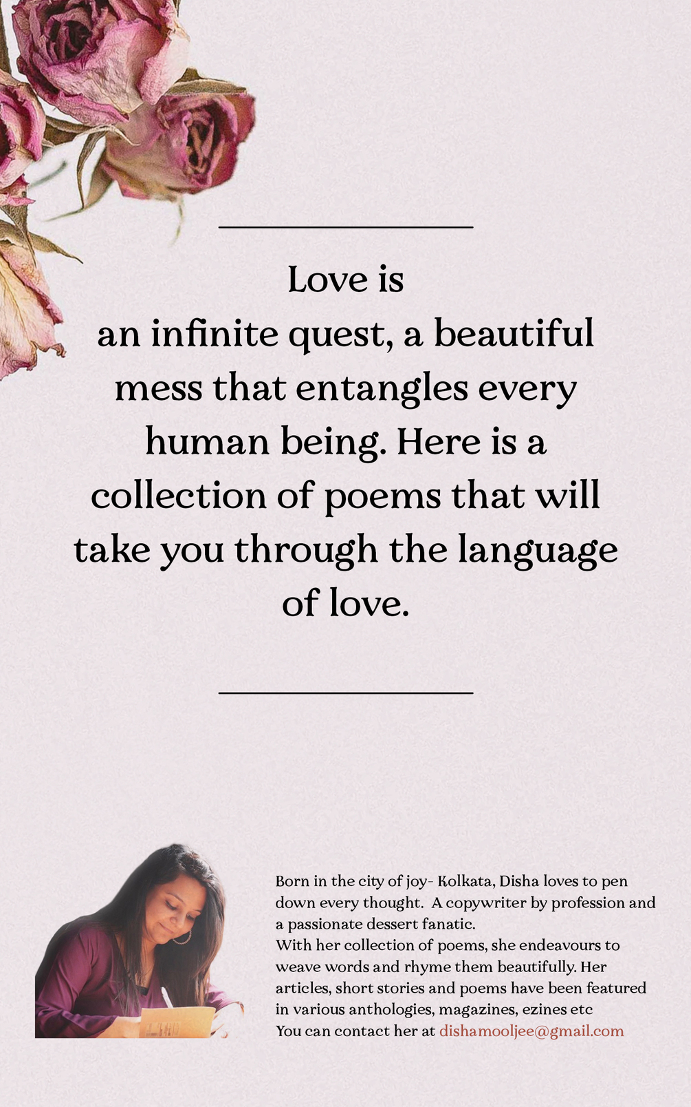 Love is---- an infinite quest, a beautiful mess that entangles every human being. Here is a collection of poems that will take you through the languages of love.